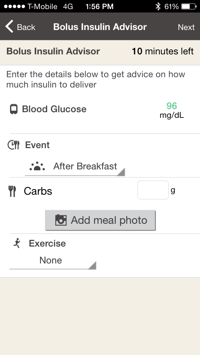 bolus advisor不允许您手动输入血糖;它一定来自计价器。你可以在不输入血糖值的情况下使用bolus advisor,尽管它只会给你给定数量的碳水化合物的建议剂量。从我们的角度来看,这是好事——这主要是一个安全问题,但也使滥用患者报告的数据成为不可能。