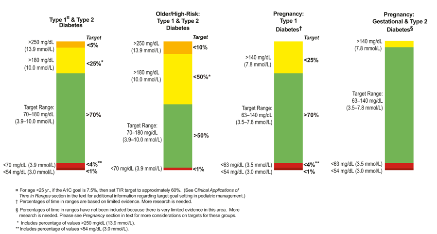 适用于1型的孕妇,目标在63-140 mg / dl的更严格范围内超过70%。(链接到较低的新生儿并发症的风险。)