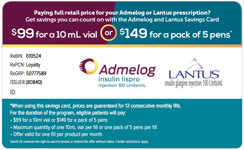 admelog是Sanofi的Humalog版本(胰岛素Lispro)。新的处方储蓄卡适用于否则需要支付全价的人员和兰花