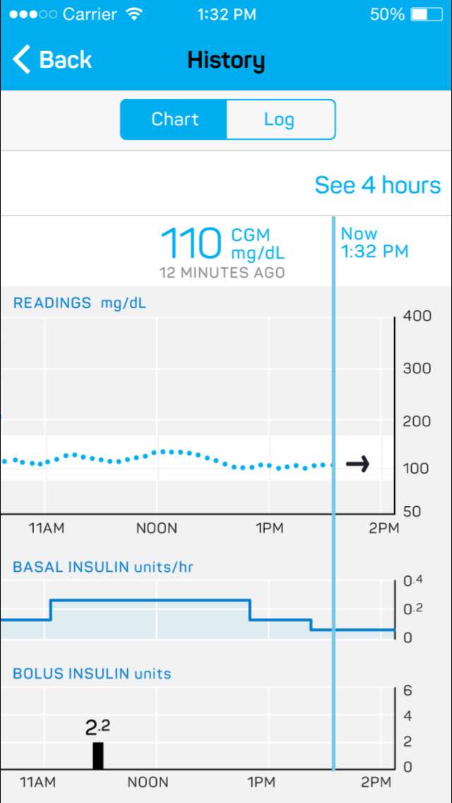 打开后,Bigfoot闭环应用主屏幕显示当前的CGM值,未来投影的CGM值,以及拍摄推注的选项。[As noted above, closed-loop will run on its own even when the phone is out of range or the app isn’t open.] A history menu shows the closed-loop chart, with the CGM trace on top and automated insulin doses on the bottom.