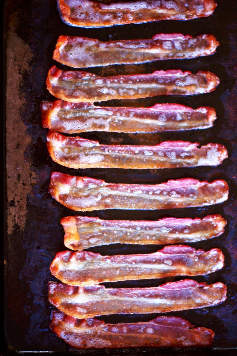 这里有一个改变游戏规则的建议:把培根放在烤箱里烤。你会认为它不可能这么好,因为如果它是,为什么你以前没有做过?但是它太好了!它是完美的。我的意思是,除非你喜欢站在炉子前烤着满身脂肪的培根,做的培根永远不会端上桌因为每个人都会走过来吃。只是说青少年(#)。使用你能找到的最好的,不含硝酸盐的培根。然后只需加热烤箱到375,培根在一层大,有框的烤盘(你会适合约10条/表,尽管你可以烤超过一次一个表),和烘烤15分钟左右,检查它首先在10和20做好准备去。记住,当你评估它的熟度时,它冷却后会变得更脆。用纸巾擦干,做个英雄。