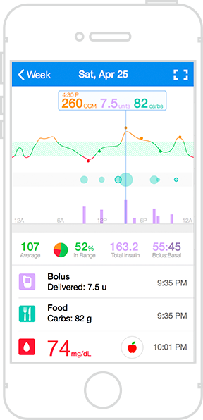 下一代Glooko平台看起来很耐心友好,包括丰富多彩的布局突出显示范围,CGM的痕迹,胰岛素剂量/泵数据,血糖仪数值,锻炼时间的用户界面,并记录碳水化合物。Glooko的长期目标是使这个数据更容易通过个性化的算法来理解。