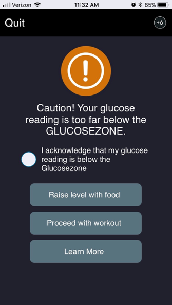 在开始任何锻炼之前,该应用程序会要求测量当前的血糖。“血糖区”——开始锻炼的安全区域——该应用程序寻找的血糖水平在100到154毫克/分升(5.5-8.5 mmol/l)之间。如果低于100 mg/dl (5.5 mmol/l),就会弹出警告: