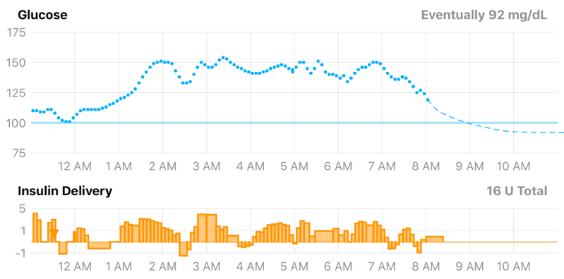 Loop的目标是最小化低血糖和高血糖,并以可定制的血糖值或范围为目标。当我的血糖趋于高于目标时,Loop提供更多的基础胰岛素(见右图)。当它下降时,它会减少或暂停胰岛素。目前,我的Loop系统的目标是100毫克/分升,并配置为每小时提供4.5单位的基础胰岛素,这是我正常基础胰岛素率的4-5倍。