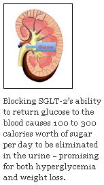 ADA公布了大量关于SGLT-2抑制剂的新数据,SGLT-2抑制剂是一种正在开发的新型口服药物,通过让使用者排尿排出多余的葡萄糖来降低血糖。我们之前已经回顾了药物的作用机制(见学习曲线从抨击#8),但基本思想是这样的:SGLT-2是一种蛋白质,主要负责确保葡萄糖在肾脏过滤后返回血液。因此,阻断SGLT-2将葡萄糖返回血液的能力会导致每天100到300卡路里的糖从尿液中排出——这一机制听起来对高血糖和减肥都很有希望。