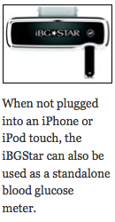 在消费者市场上,结合两种或两种以上产品的发明已经有很长的历史了,比如餐叉、预拌花生酱和果冻,还有时钟收音机。在这些情况下,组合往往大于部分之和。在糖尿病中,胰岛素笔为注射器和小瓶做到了这一点,而在未来,人工胰腺有望为CGM和胰岛素泵做到这一点。这个月,我们有机会测试最新的糖尿病组合产品:赛诺菲安万特/ AgaMatrix iBGStar这是第一台直接连接iPhone和iPod touch的血糖仪。