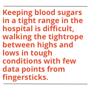底线:在医院里,血糖保持在一个狭窄的范围内(70-140毫克/分升)是非常困难的,在艰难的条件下,从手指上获取的数据点很少,在高和低(都很糟糕)之间走钢索。