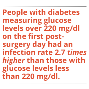 在一项研究中在美国,术后第一天血糖水平超过220 mg/dl的糖尿病患者有感染率高2.7倍比那些葡萄糖水平小于220mg / dl的那些。(是的,那是我。)在另一项研究,术后血糖超过180mg /dl翻了一倍住院时间(12天)与血糖低于140 mg/dl的患者(6天)比较。