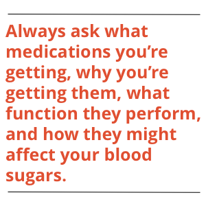这也涉及一种更广泛的观点,在医院内外施加:总是问你所获得的药物,为什么你正在得到它们,它们的功能,它们可能如何影响血糖,以及(如果结果不理想)你的其他选择是什么。