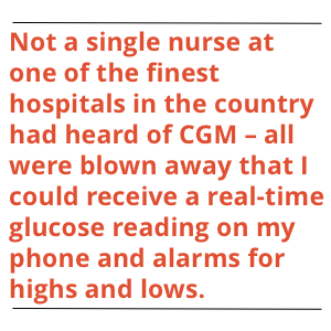 在全国最好的医院里,没有一个护士听说过CGM——所有人都完全被我的手机上可以实时接收血糖读数和血糖高低的警报所震惊。“为什么我们没有这个?!!这是一种常见的、略带愤怒的情绪。