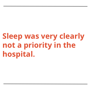 到了第三天,我非常沮丧,于是我敦促护理人员以一种更明智的方式错开我的生命体征和药物,让我有更多不受打扰的睡眠。这对我们绝对有帮助。