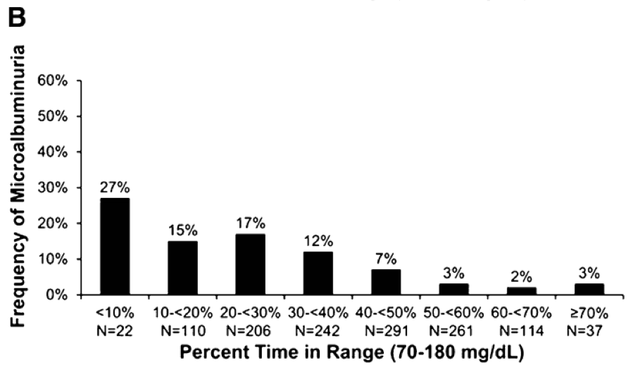 从长期来看,早期研究表明,时间范围是长期糖尿病并发症的一个很好的预测指标(例如,糖尿病护理2019,糖尿病护理2018).在对一项具有里程碑意义的研究(DCCT)的重新分析中,研究人员发现不同程度的时间范围和糖尿病并发症(眼病(视网膜病变)和肾脏疾病(微量白蛋白尿))之间存在很强的关系。随着时间范围的增加,并发症减少。
