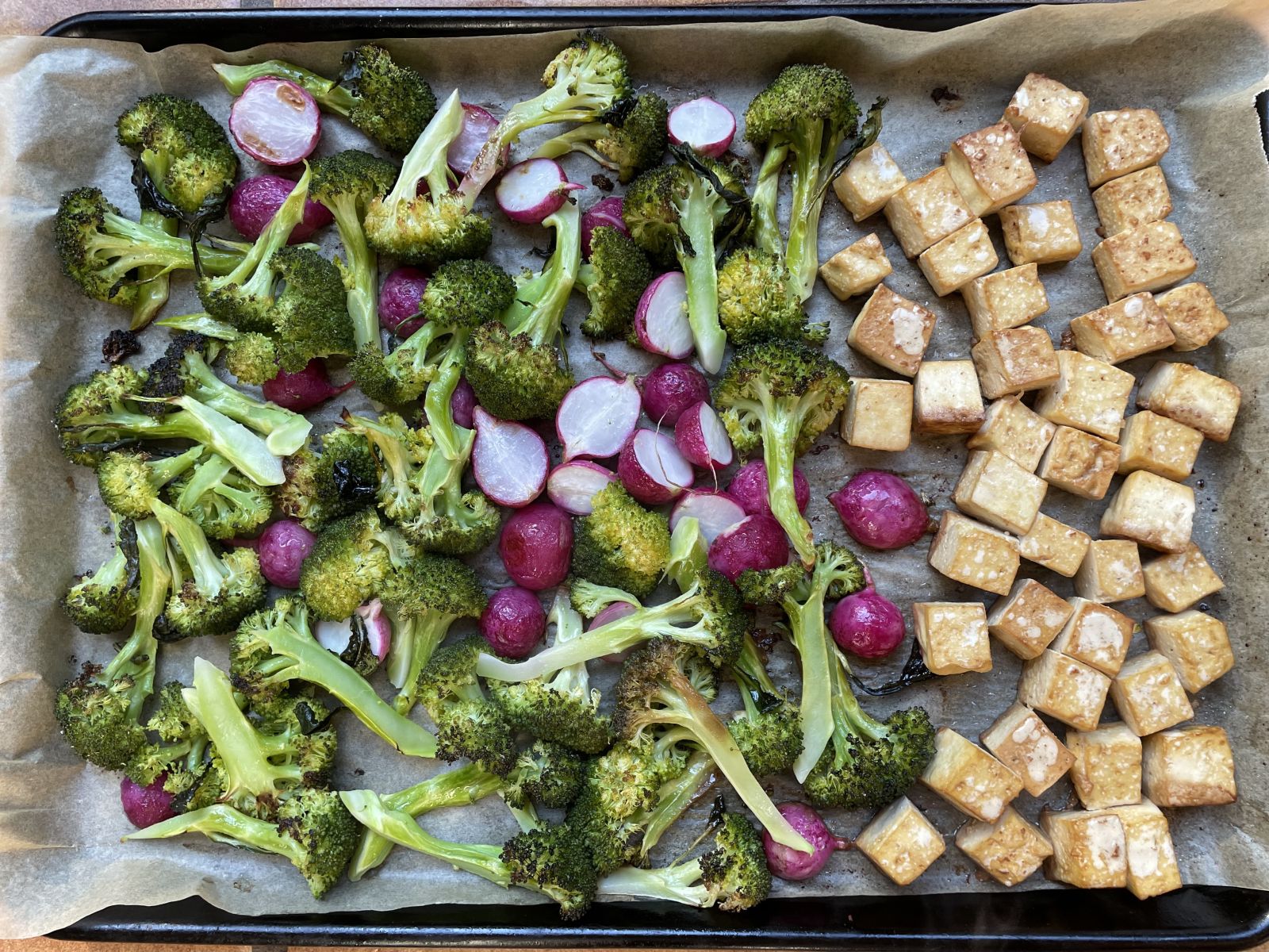 把西兰花和萝卜放在一个大碗里,淋上两汤匙油和所有的盐。用手搅拌均匀,让所有的西兰花和萝卜都沾上一点油,然后把它们全部摊在平底锅上,留出大约1/3的开口,用来放豆腐。