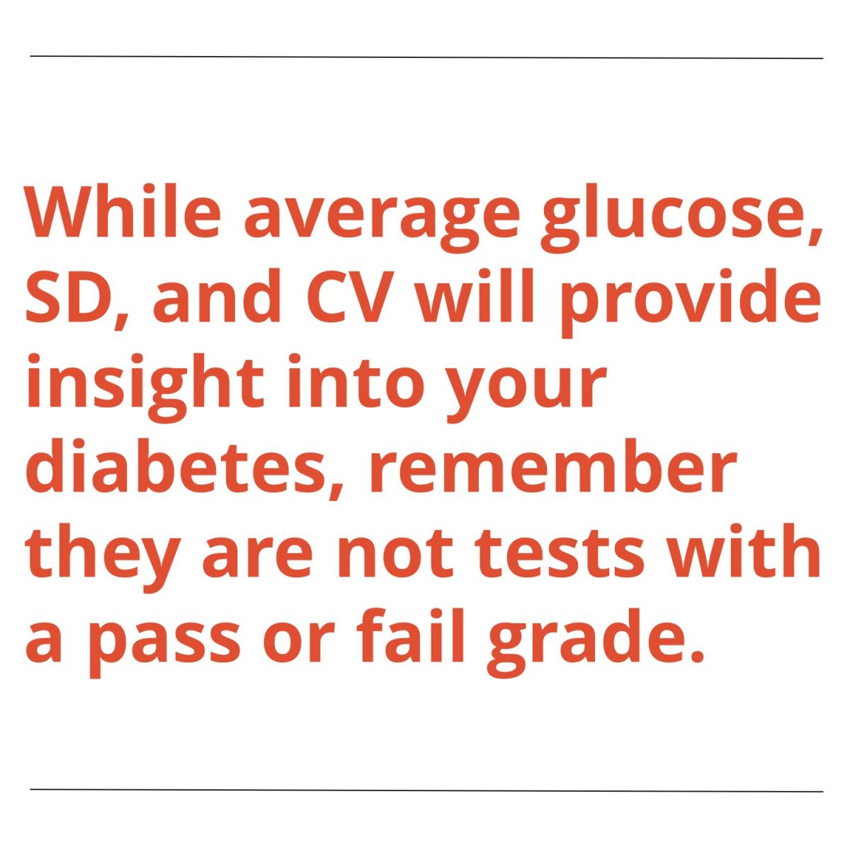 CV是一个简单计算的花哨术语:用SD除以平均葡萄糖,再乘以100得到百分数。例如,如果SD是50毫克/分升,而平均葡萄糖是150毫克/分升,那么用50除以150乘以100,CV是33%。