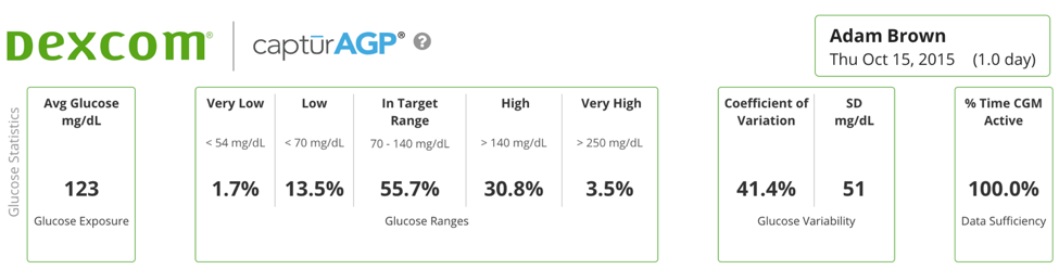 多年来,亚当的血糖值变化很大,原因有很多——尤其是在他患CGM之前!这是他测试的一个低碳水化合物和高碳水化合物.10月15日th在美国,亚当的平均血糖是123毫克/分升,但他的一天充满了令人疲惫的起起落落。亚当的标准摄入量为51毫克/分升,这一数字表明了他当天的挑战。