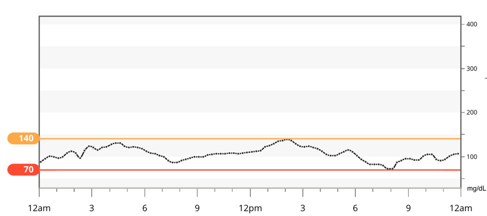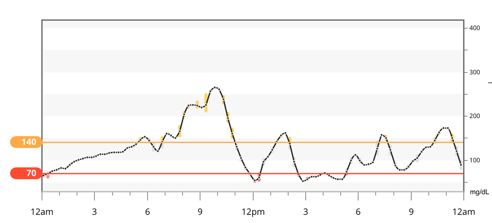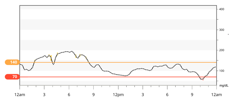 对于那些还不熟悉CGM的人来说,每个黑点代表24小时内每5分钟摄取的葡萄糖值。图表从左边的午夜开始,中间是中午12点,右边是午夜。