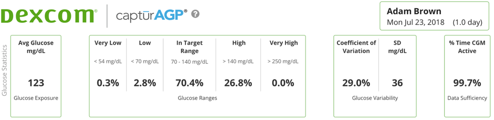 让我们再来看看另一天同样的平均血糖123毫克/分升,但这一次,变化性要小得多。7月23日理查德·道金斯,亚当的平均血糖也是123毫克/分升——与上述高变异性的平均水平相同。然而,在36 mg/dl时,SD要低得多,这意味着CV为29%(即小于目标平均值的1/3)。尽管这一天的平均血糖水平与10月15日相同th(上图),Adam在范围(70-140 mg/dl)的时间是70%,远远高于第一个例子,这里的CV大约是第一个例子的一半水平。亚当的低血糖时间也低得多,为2.8%——尽管这仍然是大约40分钟。