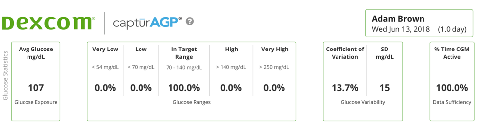 6月13日,亚当经历了他今年血糖变异性的最低水平:平均血糖为107毫克/分升,标准偏差仅为15毫克/分升,换算成CV仅为14%。亚当的时间范围是在这个特殊的亮点日。如下表所示,他的血糖一整天都非常稳定,从未低于70毫克/分升或高于140毫克/分升。