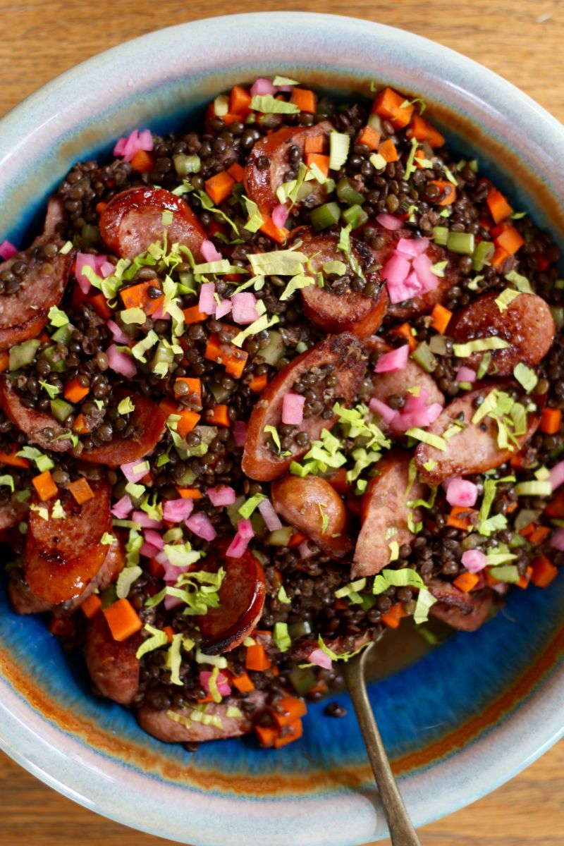 这是一种美味、令人满足、营养丰富的主菜沙拉,同时又嫩又脆、味道浓郁。关于食材的一些注意事项:你当然可以使用普通的棕色扁豆,但如果你能找到绿色或黑色的小扁豆,它们仍然相对便宜,而且它们在沙拉中更能保持形状。此外,芹菜叶,在我看来,是一种免费的草药,在你的一堆芹菜里,你可以使用它们!最后,我在这里用的是波兰熏香肠(kielbasa),但“蒜味香肠”的另一种说法是“热狗”——你可以随意把在平底锅里烤成棕色的香肠切片代入。(如果可以的话,尽量买不添加硝酸盐或亚硝酸盐的香肠。)或者不加香肠,在每一份上面加一个荷包蛋(我给我的素食女儿就是这样做的)。