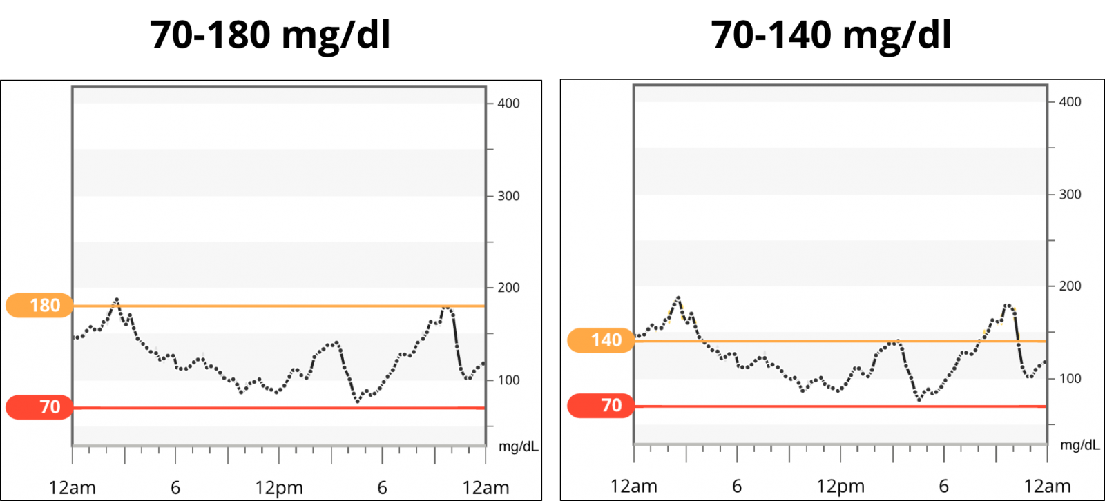 就我个人而言,我试图将目标定在70-140毫克/分升的更严格范围内,部分原因是我可以使用CGM,并且在这个范围内感觉自己是“最好的自己”(精力、情绪、生产力等)。没有糖尿病的人通常一天的大部分时间都在这个区域,所以这是我努力追求的目标——当然,我几乎从来没有100%的时间都在这个区域。